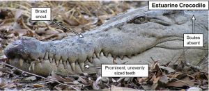 An estuarine crocodile, also called the saltwater crocodile or saltie, is found in estuarine and freshwater rivers, estuaries, creeks, swamps, lagoons, billabongs, coastal areas and offshore islands across Queensland typically from north of the Boyne River near Gladstone, north up through Cape York and west to the Northern Territory border. It is distinguishable by its broad snout, jagged teeth line and long teeth.