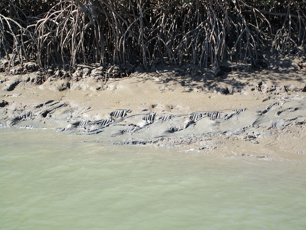 Crocodile tracks are footprints and tail drags left behind in mud or sand when a crocodile travels between waterbodies or looking for food. Tracks help to identify size, density, hierarchy and behavioural patterns of crocodiles in the area.