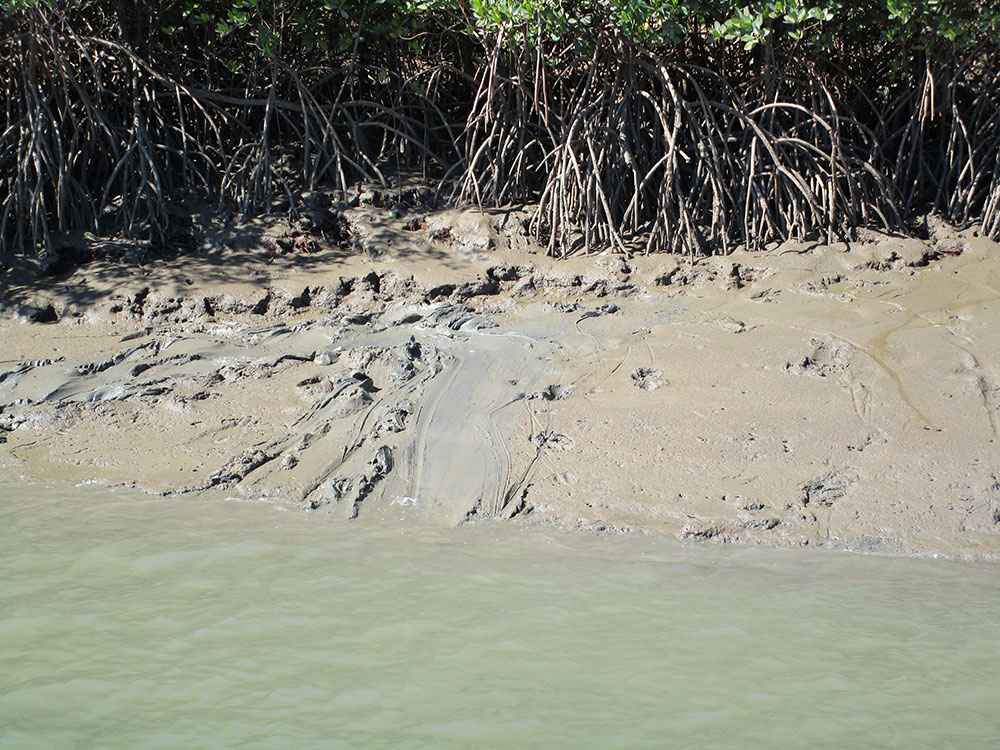 A crocodile slide is a track or mark left behind by a crocodile when they move up, down or through sand or mud banks. It is often associated with a favourite basking spot or shallow water wallow, which can sometimes be hidden from view in mangroves or up a high bank. Slides on a bank are often in a single line as the crocodile has moved up the bank to bask and/or the tide has dropped around it. For large crocodiles, there is sometimes an entry and exit slide mark.