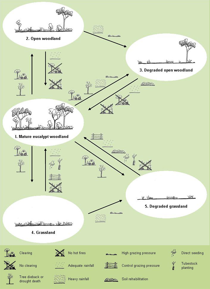 - Heavy grazing of a mature eucalypt woodland (state 1), with or without heavy rainfall, can produce areas of bare, compacted soil, through both water and wind erosion. This creates a degraded open woodland (state 3) or degraded grassland (state 5).
