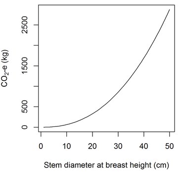 The relationship between rainforest tree stem diameter and the amount of above-ground carbon stored (expressed as carbon dioxide equivalents (CO2-e). Breast height = 1.3m. Based on allometry from Keith et al. 2000