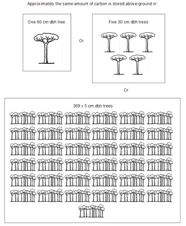 Large trees hold far more carbon than small trees because the amount of carbon held increases exponentially as the trunk diameter of a tree increases. For example, the carbon held above ground in a large tree (e.g. 60cm in diameter) is about the same as that held in 350 smaller trees (e.g. 5cm diameter).