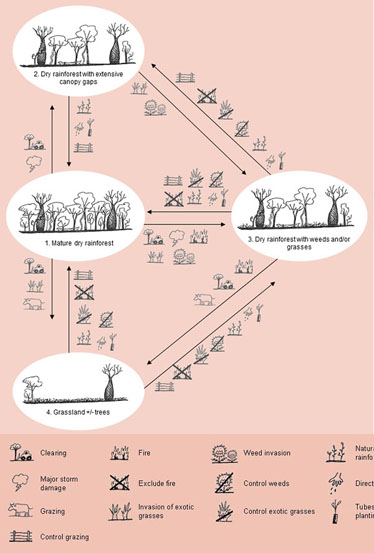 - Weed invasion can occur with or without disturbance (state 3), as undisturbed dry rainforest tends to have a more open canopy than undisturbed wet rainforest.