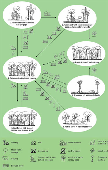 - Creating open areas alongside rainforest patches can lead to weed invasion of the rainforest edges (state 7).
